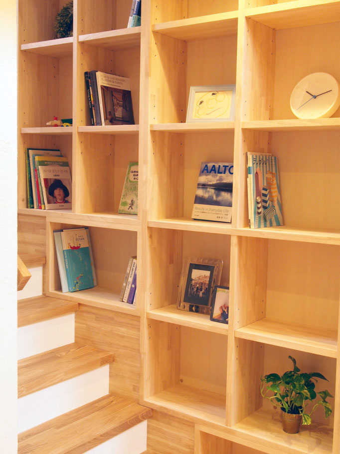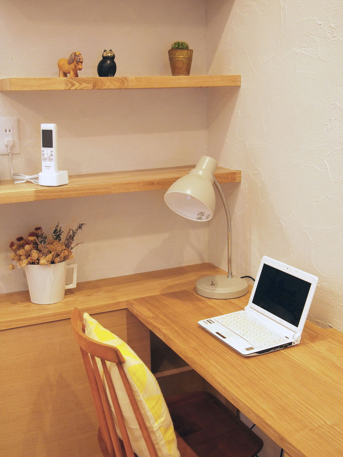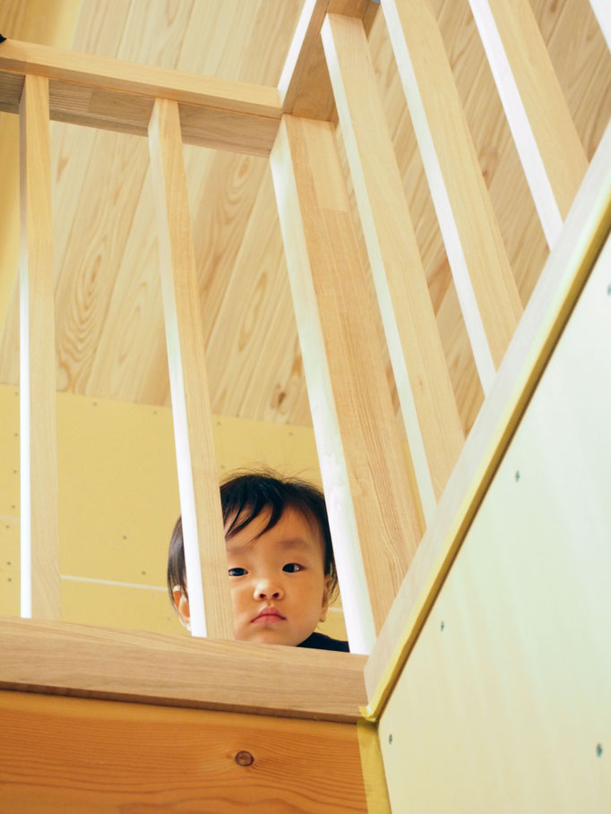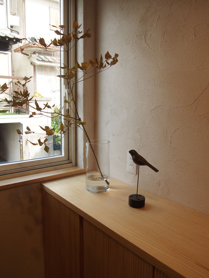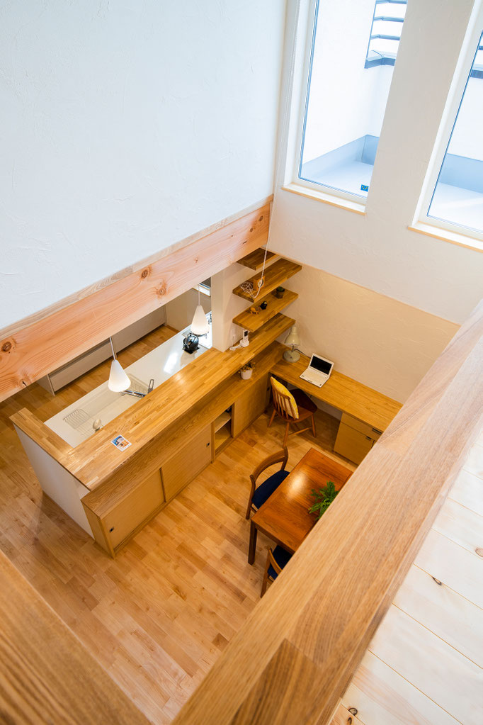 今回の建物で一番考慮したことは、吹き抜けを通して家全体が明るく、一年中快適な温度と湿度で暮らせることです。吹き抜けのハイサイド窓からは、心地よい光がリビングに降り注ぎます。家の中の温度と湿度を快適に保つために、断熱材にはセルロースファイバーを使用し、気密工事を徹底し、サッシは樹脂製のペアガラス、計画的換気を行うため24時間機械換気を採用しています。また、室内は調湿する塗り壁材(深呼吸)と無垢のフローリングを使用しました。